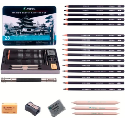 یک مجموعه طراحی حرفهای و آکادمیک از برند افسانهای چینی ماری (تأسیس در سال ۱۹۱۹). ۲۳ ابزار با دقت انتخاب شده در یک جعبه فلزی جمع و جور و بادوام - هر آنچه برای خلق طرحهای رسا، پردازش تُنها و گرافیکهای دقیق نیاز دارید.
