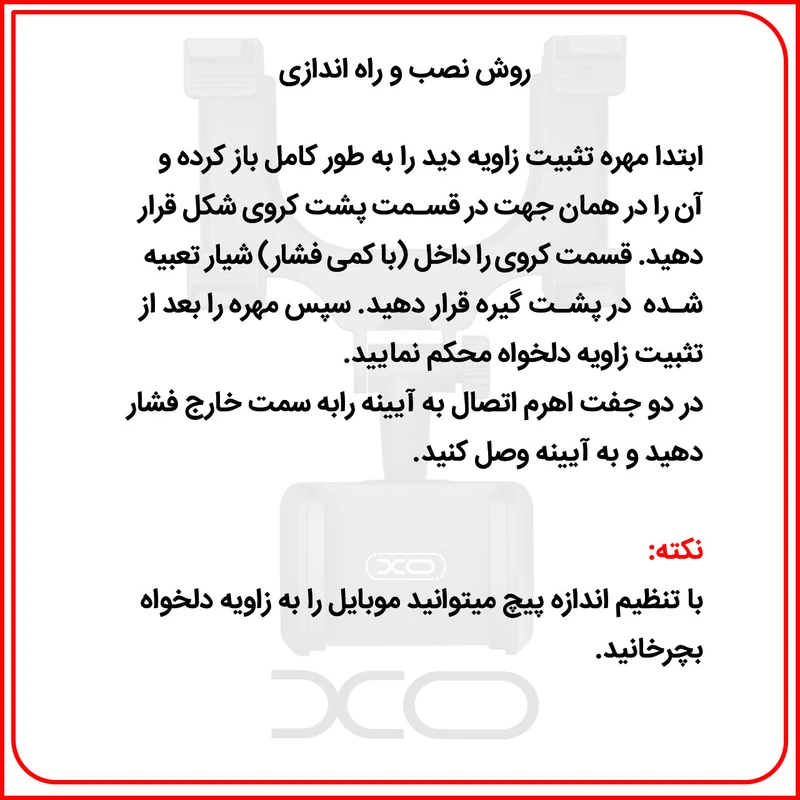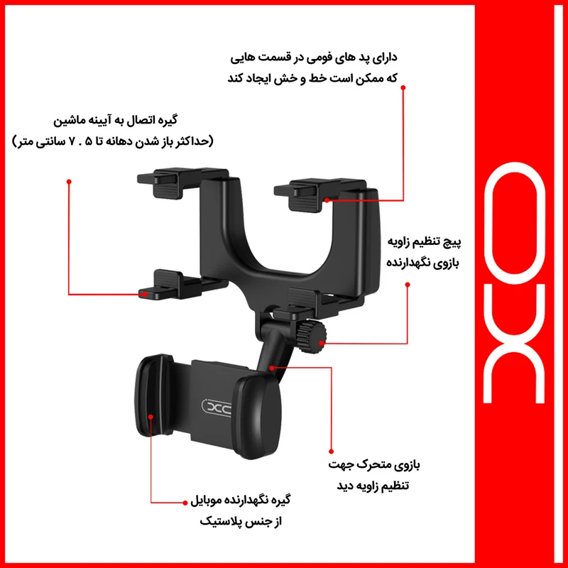 قابلیت چرخش ۳۶۰ درجه قابل اتصال به آیینه خودرو ساخته شده از پلاستیک سخت دارای بازوی متحرک جهت تنظیم زاویه دید باز شدن دهانه نگهدارنده موبایل تا ۹ سانتی متر دارای پد های سیلیکونی در قسمت نگهدارنده آیینه حداکثر فاصله باز شدن دهانه گیره اتصال به آیینه ۷.۵ سانتی متر قابلیت چرخش ۳۶۰ درجه قابل اتصال به آیینه خودرو ساخته شده از پلاستیک سخت دارای بازوی متحرک جهت تنظیم زاویه دید باز شدن دهانه نگهدارنده موبایل تا ۹ سانتی متر دارای پد های سیلیکونی در قسمت نگهدارنده آیینه حداکثر فاصله باز شدن دهانه گیره اتصال به آیینه ۷.۵ سانتی متر