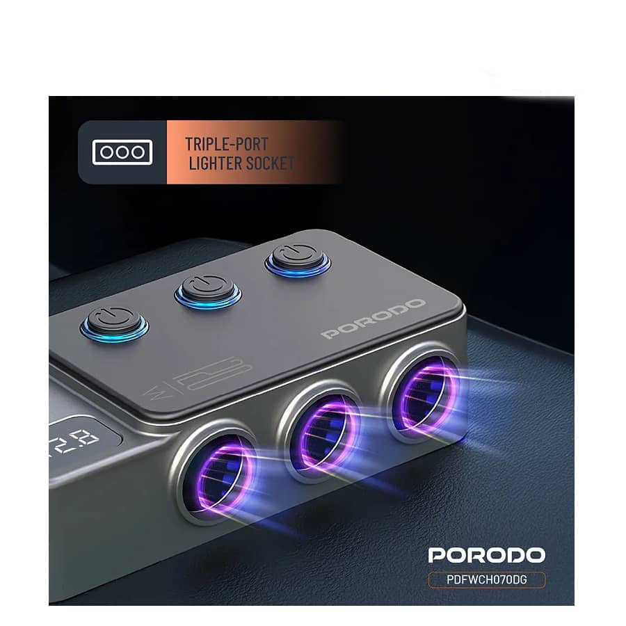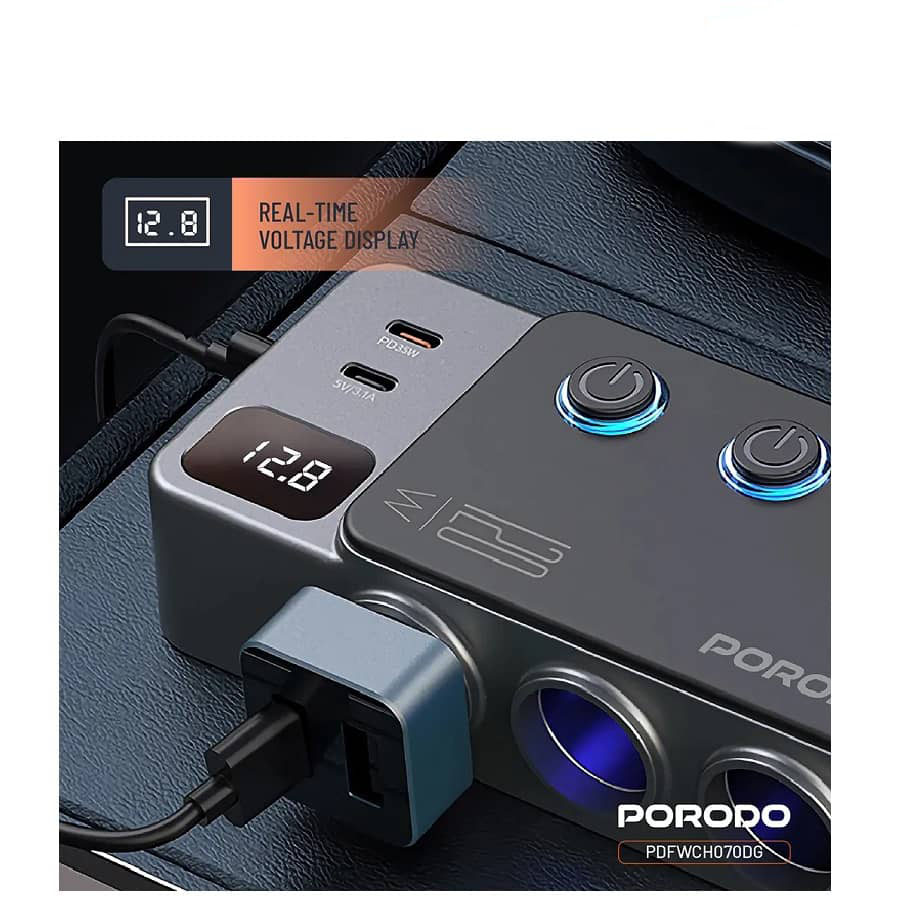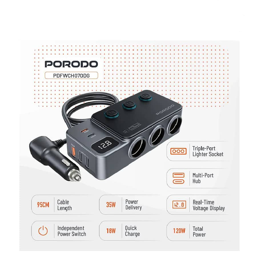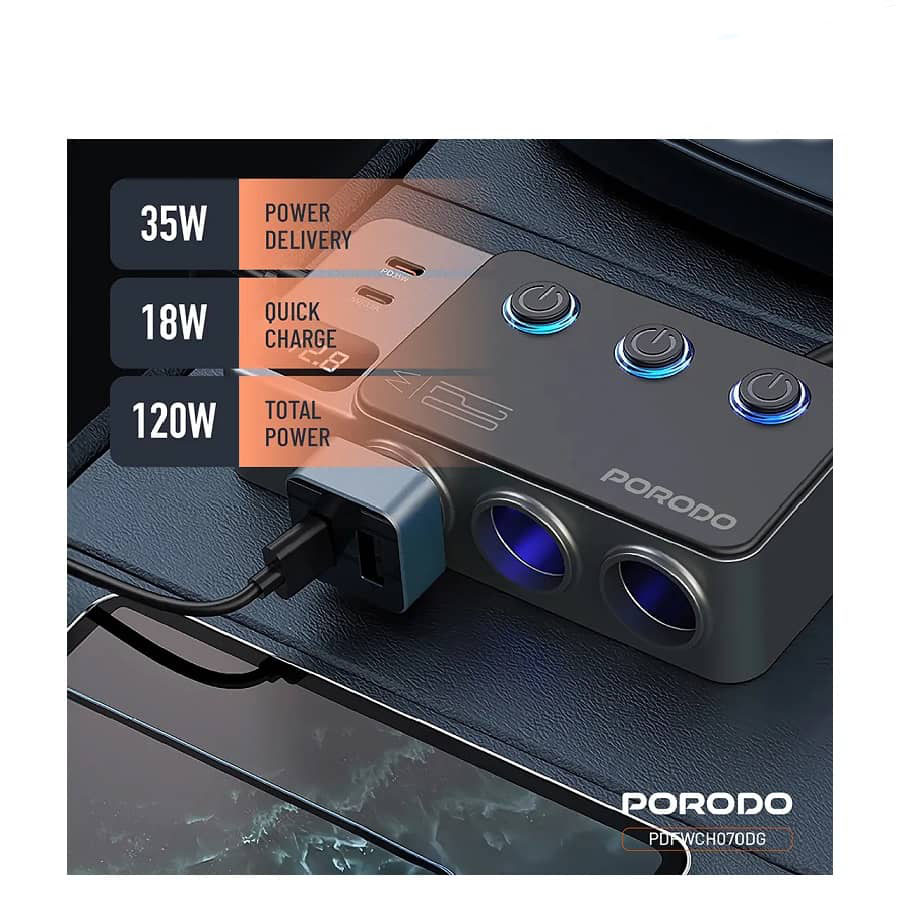 هاب و شارژر فندکی 120 وات پرودو مدل PDFWCH070هاب و شارژر فندکی 120 وات پرودو مدل PDFWCH070 یک گزینه قدرتمند و کاربردی برای شارژ همزمان چند دستگاه در خودرو است. این محصول از برند معتبر Porodo با توان خروجی بالا، امکان شارژ سریع انواع گوشی موبایل، تبلت، پاوربانک و سایر گجتهای دیجیتال را بدون افت سرعت فراهم میکند.طراحی چندپورتی این شارژر، نیاز به استفاده از چند شارژر مجزا را از بین برده و انتخابی ایدهآل برای سفرهای طولانی و استفاده روزمره محسوب میشود. بدنه مقاوم و سیستمهای محافظتی هوشمند، از دستگاهها در برابر نوسان ولتاژ، داغ شدن و اتصال کوتاه محافظت میکنند. اگر بهدنبال یک شارژر فندکی قدرتمند، ایمن و بادوام هستید، مدل PDFWCH070 پرودو انتخابی مطمئن و مقرونبهصرفه خواهد بود.
